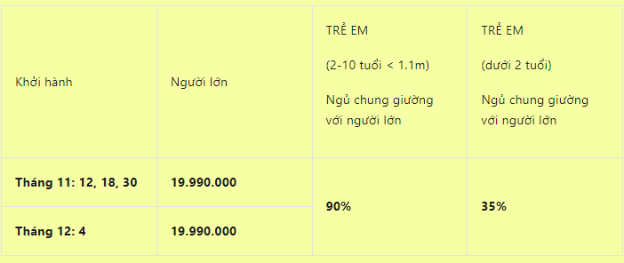 🧒 Trẻ em từ 2 - 11 tuổi: Tính 90% giá tour, ngủ cùng giường với bố mẹ ở khách sạn