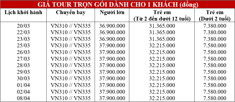 Khởi hành: Tháng 3: 20/03; 22/03; 23/03; 25/03; 26/03; 28/03; 29/03; 30/03