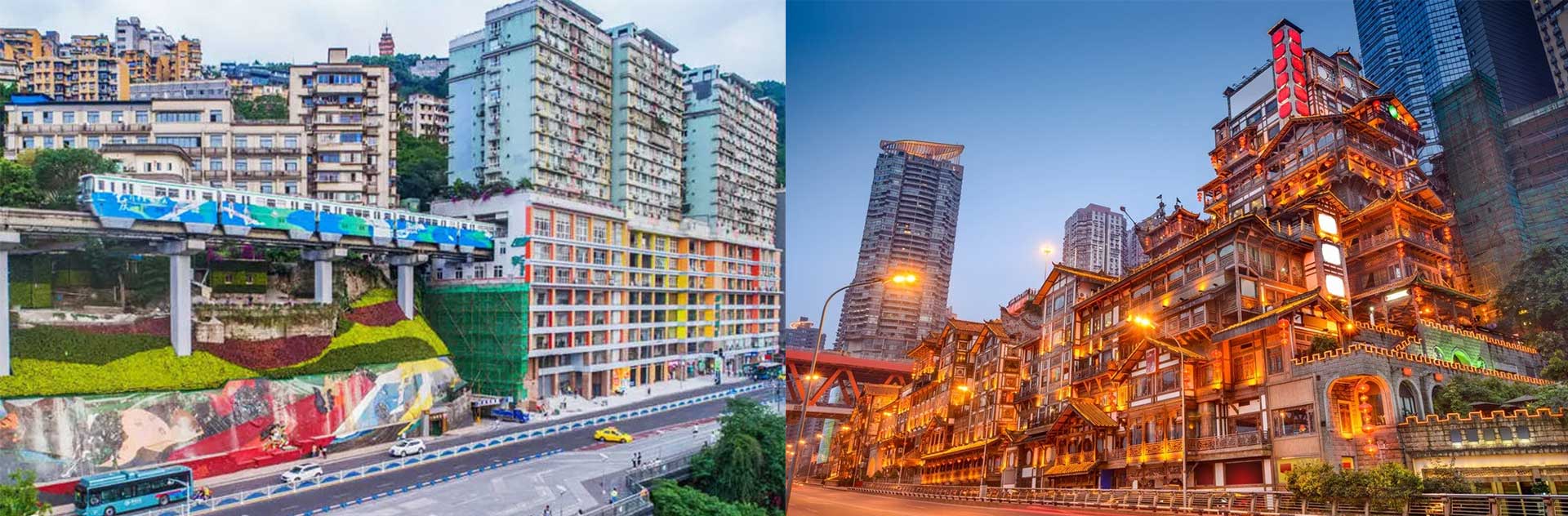 Phố Cổ Hồng Nhai Động - Khu phố cổ 11 tầng lầu với mái ngói rêu phong, hoa văn chạm trổ, phía sau là những tòa nhà chọc trời, nằm ở khu trung tâm thương mại thành phố Trùng Khánh, bên bờ sông Dương Tử, là điểm bờ sông giao nhau của hai con sông Trường Giang và sông Gia Linh.