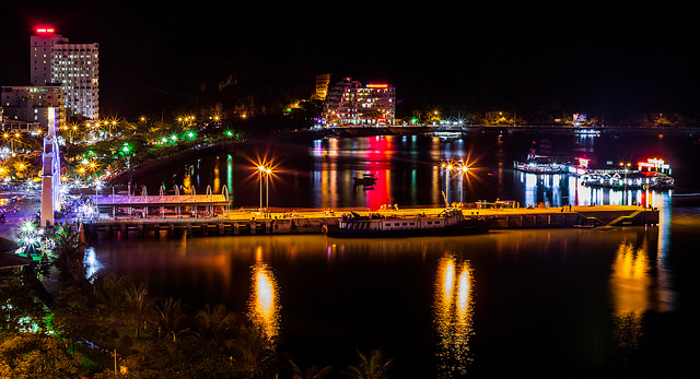Trăng lên chiếu xuống làn nước lấp la lấp lánh, mặt biển như được dát bạc. Những con thuyền neo đậu trên biển in bóng trên mặt nước đẹp y như một bức tranh thủy mặc.